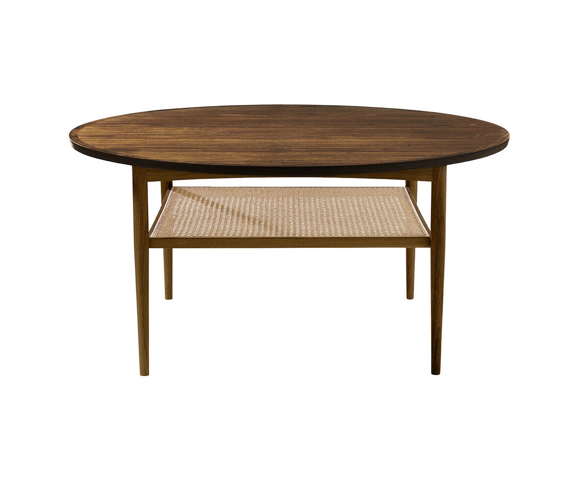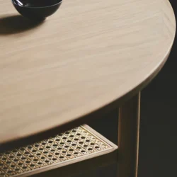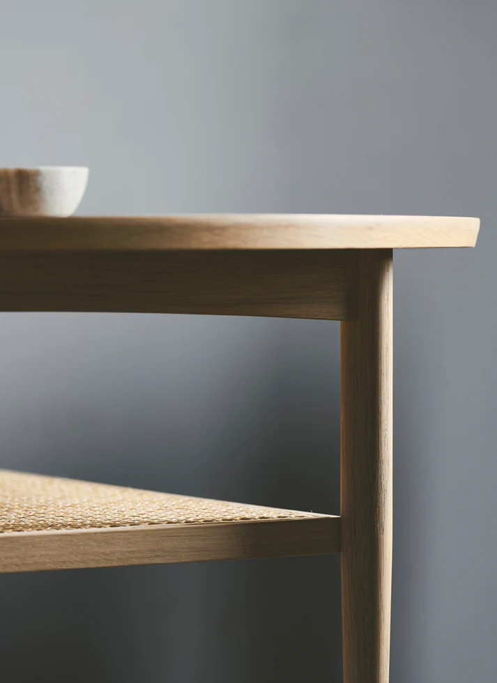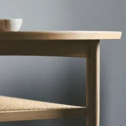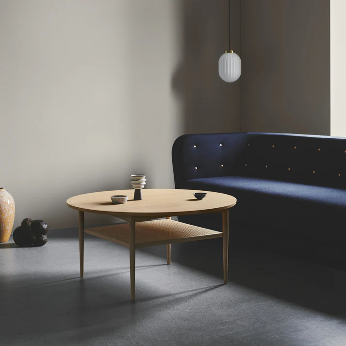 Aakjaer Furniture – NO.100 Sofabord Røget eg. Sofabordet No.100 er designet i 1960’erne af Jørgen Aakjær Jørgensen. No.100 har en smuk magasinhylde i rørflet, som med sit karakteristiske look, giver hjemmet masser af charme og et nutidigt udtryk. No.100 er et smukt eksempel på, hvordan fransk rørflet går perfekt i spænd med tidens organiske indretningstrend – uden at gå på kompromis med stilrent design. Det franske flet giver en smuk kontrast, så̊ møblet på en gang får et svævende og solidt udtryk.