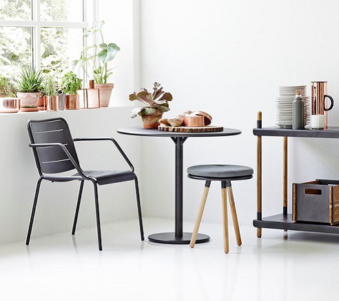 Vælg mellem en sort eller en hvid aluminiums top kombineret med ben af teak træ. Area bordet/stolen er designet af Cane-line Design Team og kan bruges både indendørs og udendørs, i al slags vejr.