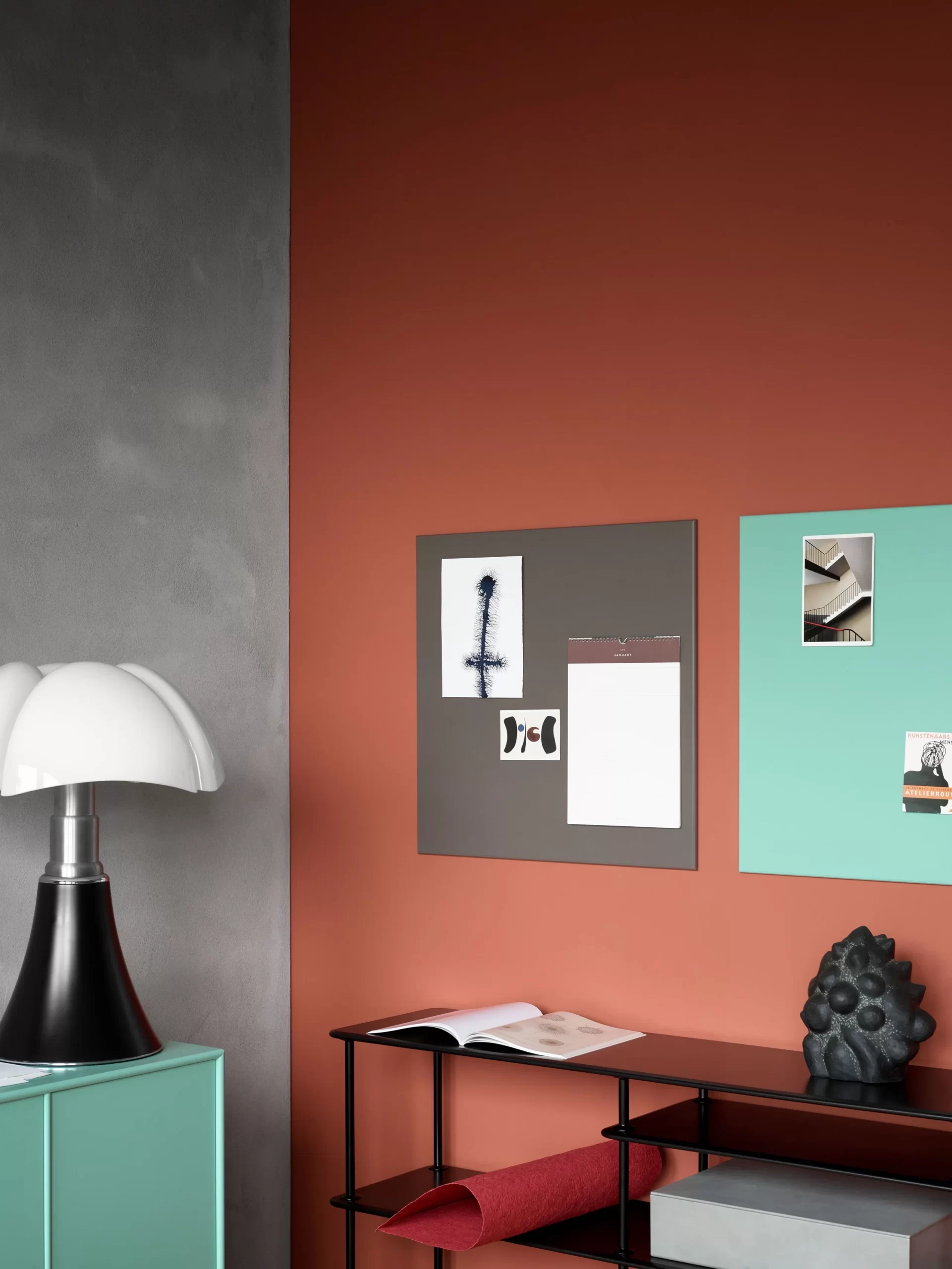 Montana Noticeboard er en magnetisk opslagstavle, som kan bruges på hjemmekontoret, i entréen, eller hvor man ellers har brug for at vise påmindelser og/eller beskeder. Opslagstavlen er lavet af en tynd stålplade på en bagplade af 12 mm MDF. Den fås i alle Montanas 41 lakfarver. Brug flere tavler sammen i din yndlingsfarver, eller vær kreativ og kombinér flere forskellige farver.