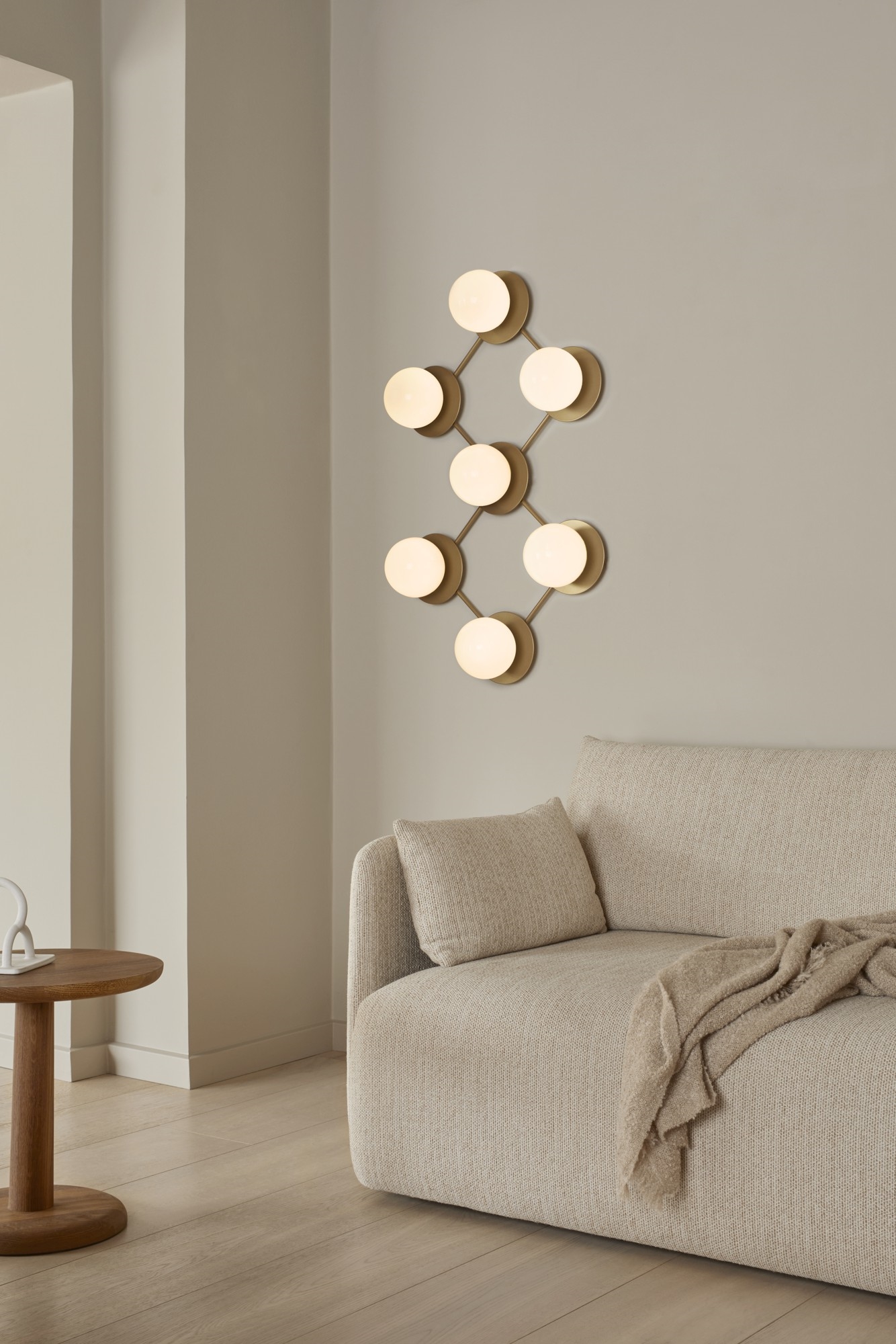 Nuura Liila 7 messing opal er en aflang modulær formation. Den tager sig flot ud som en aflang lysskulptur og monteres lodret eller vandret. Liila 7 er oplagt på væggen i spisestue eller stuen, som et lysende sengegærde over sengen eller i loftet i den smalle entré, hvor god kvalitetsbelysning ønskes. Den modulære konstruktion giver gode muligheder for at montere flere sammen.