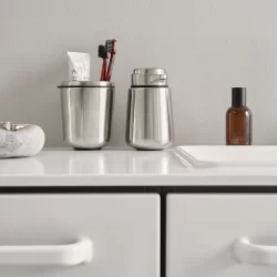 Vipp tandbørstekrus er ren funktionalitet til badeværelset. Med en udskiftelig indersektion adskiller tandbørstekruset tandbørsten fra tandpastaen. En skridsikker base beskytter overflader.