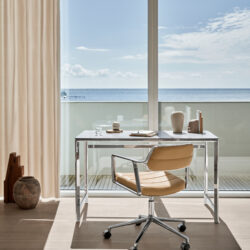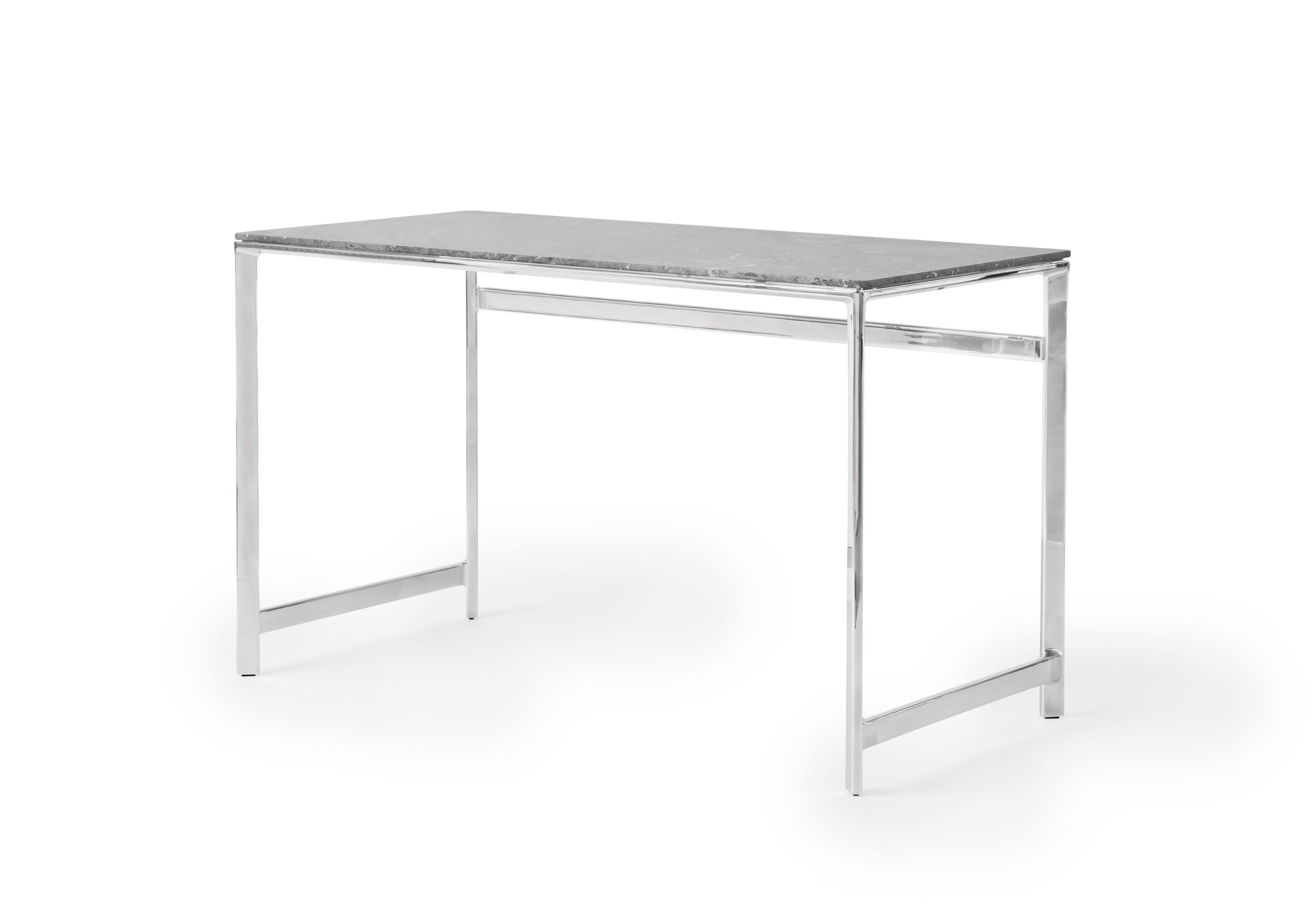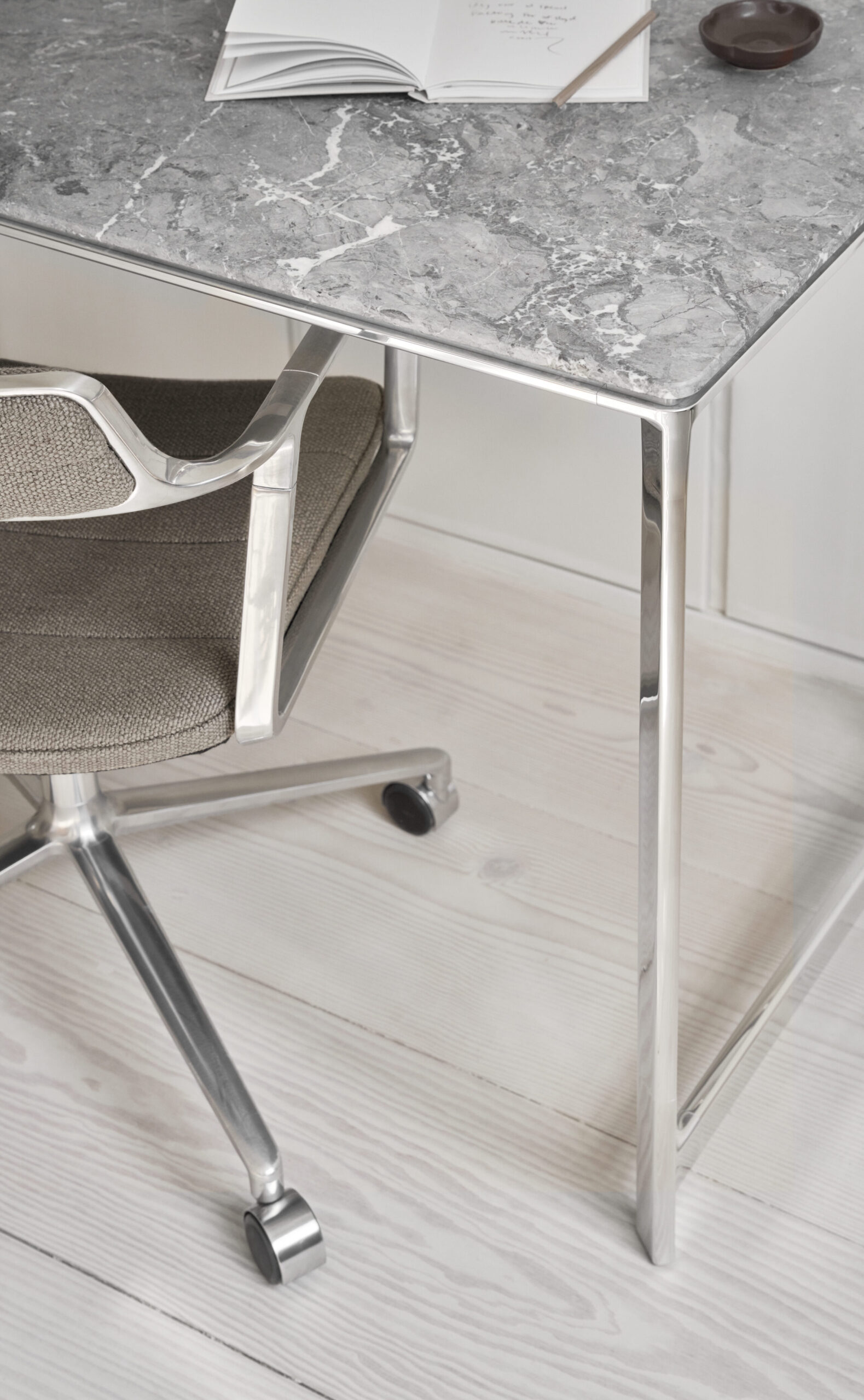 VIPP430 Studio Desk Skrivebord Ocean Grey. Smukt, enkelt og stilrent skrivebord fra Vipp. Studio Desk kommer med stel i rå aluminium og bordplade af gråt marmor. Den vilde marmor står enormt flot til rammen i det sølv aluminium, og de to kontraster komplimenterer hinanden perfekt. Vipp Studio Desk er til dig, der ønsker et stilet hjemmekontor med enkle rammer, der ikke larmer for meget. Sæt Studio Desk sammen med Vipps populære Swivel Chair for et gennemført look.