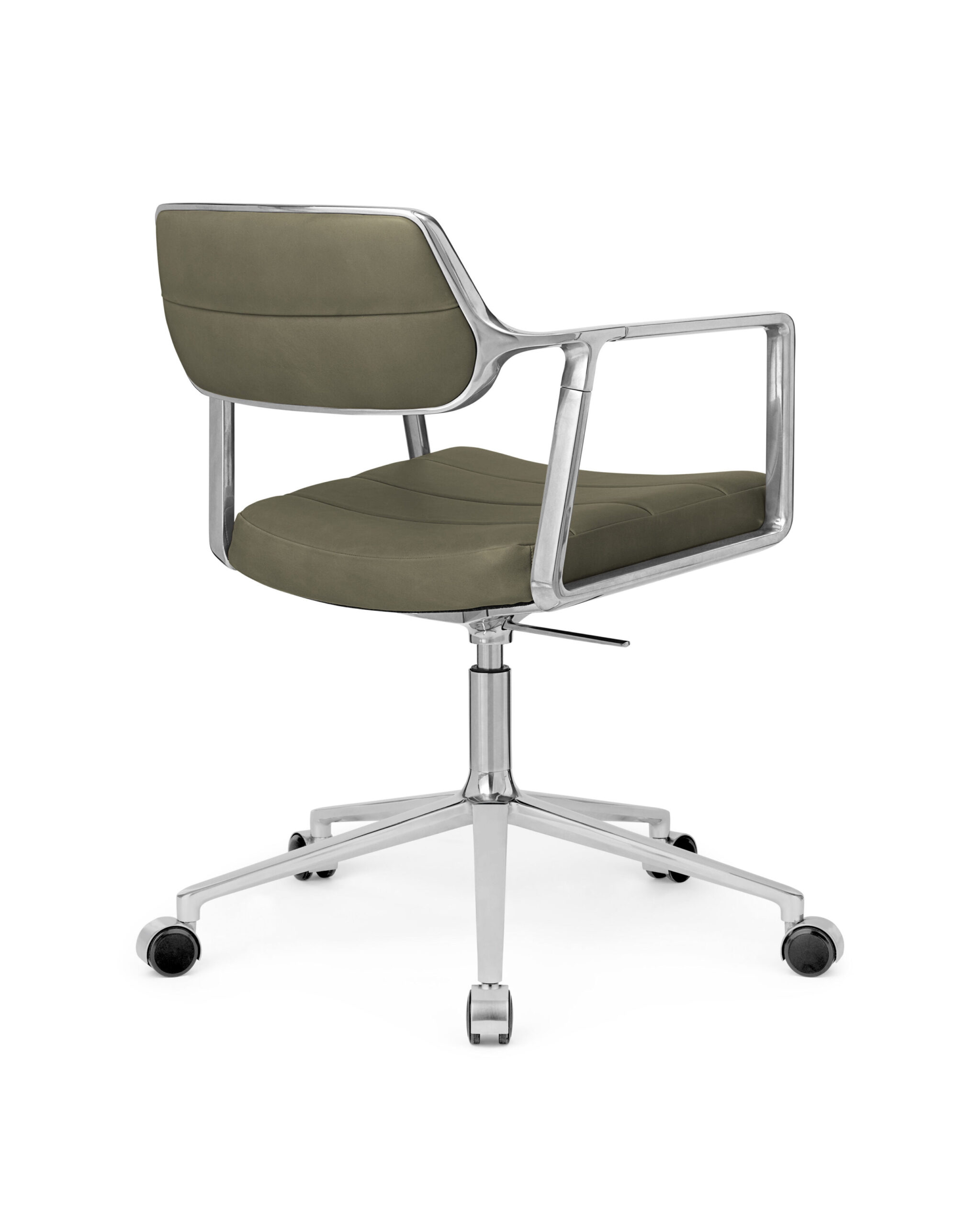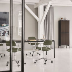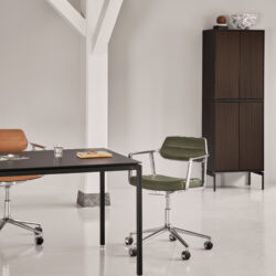 Vipp har forfinet sin drejestol ved at tilføje mere komfort og nye funktioner, der forbedrer dens ergonomi og siddeoplevelse. Gentaget fra den originale Drejestol fortsætter de slanke armlæn lige ind i det diskrete, polstrede ryglæn, hvilket giver stolen et næsten luftigt udtryk trods solide komponenter.