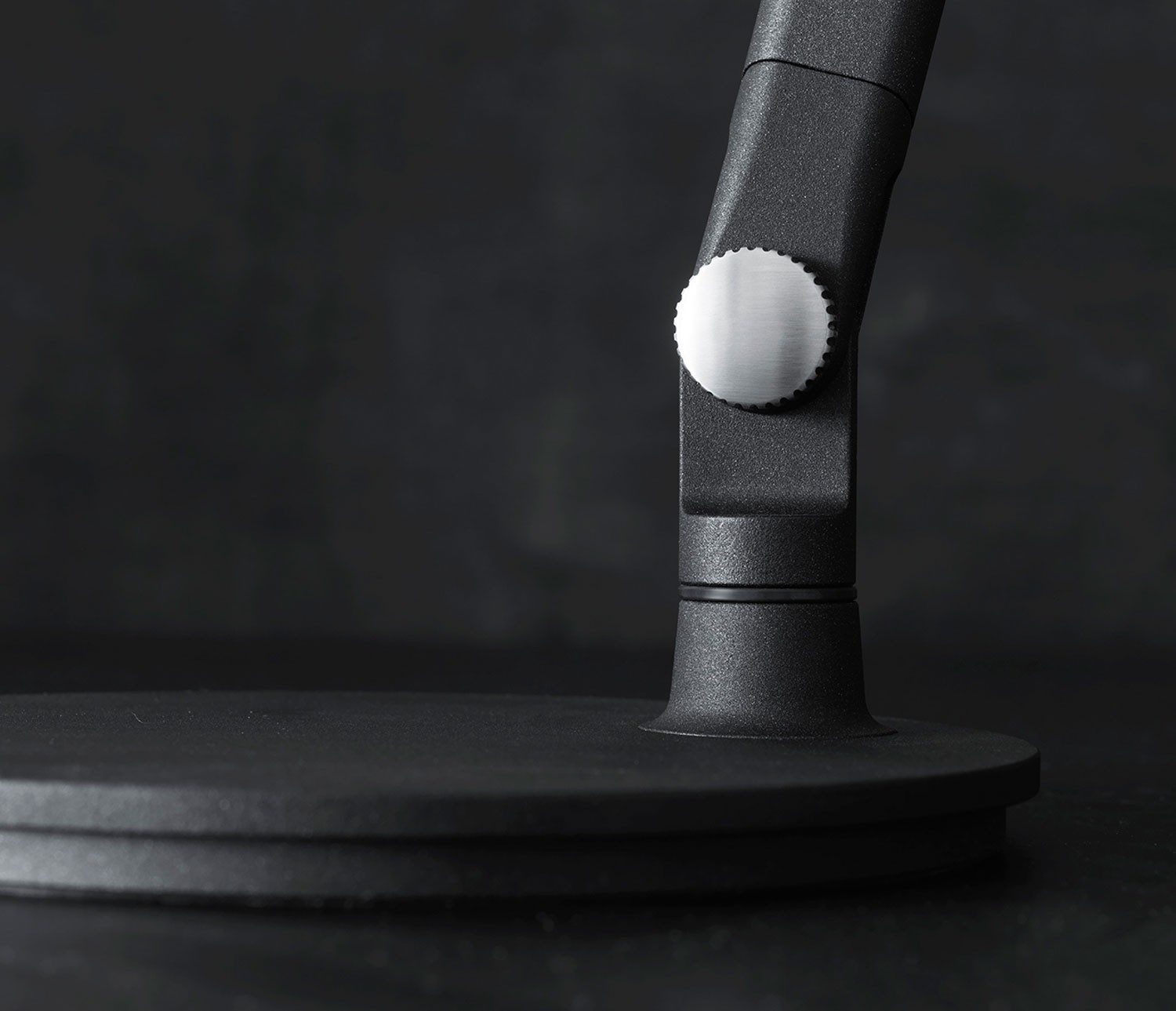 Vipp 521 bordlampe er udstyret med analoge detaljer såsom en justérbar arm til fokuseret lys, fingerskruer til at låse lampens position samt en solid base for stabilitet.